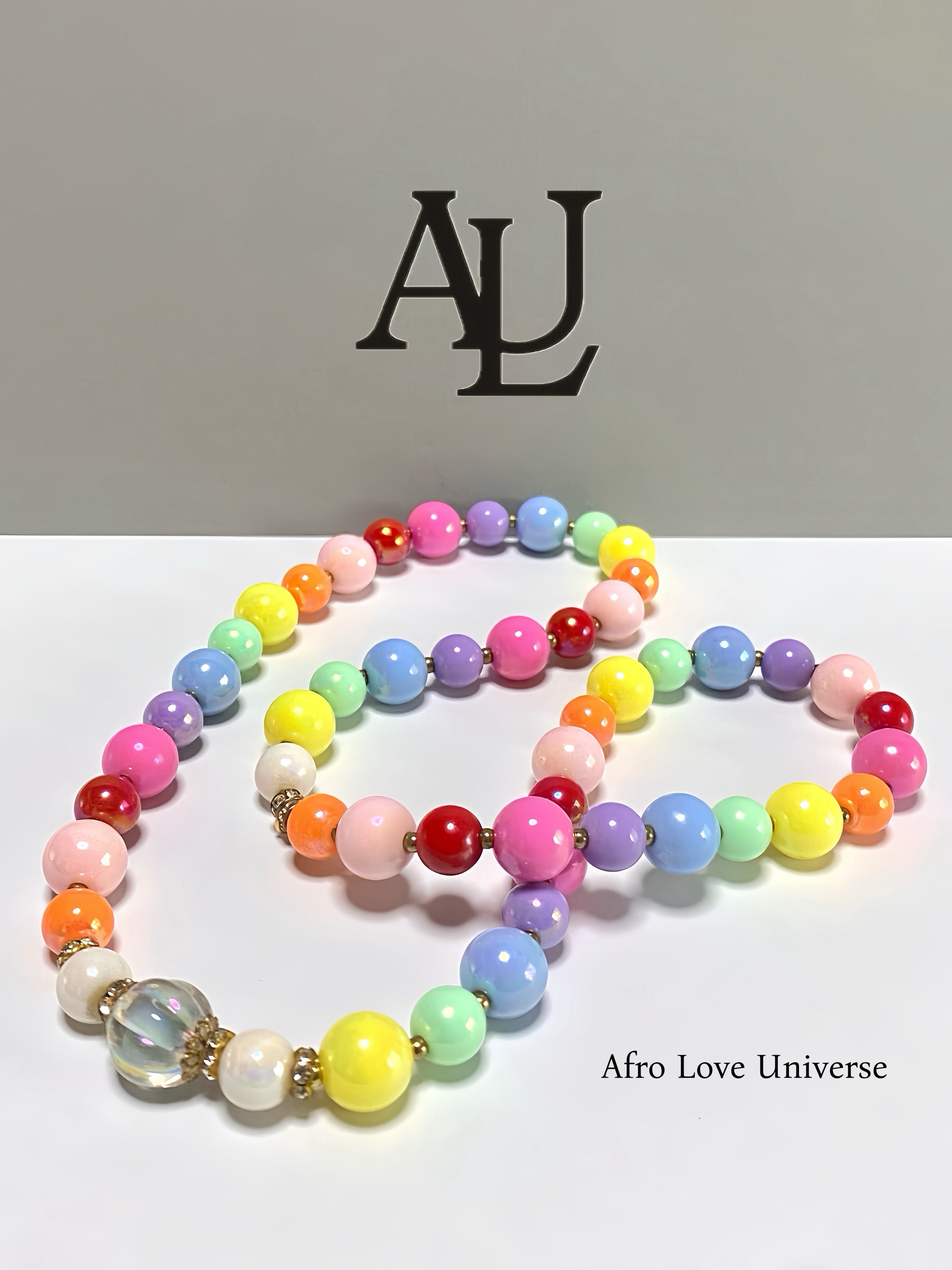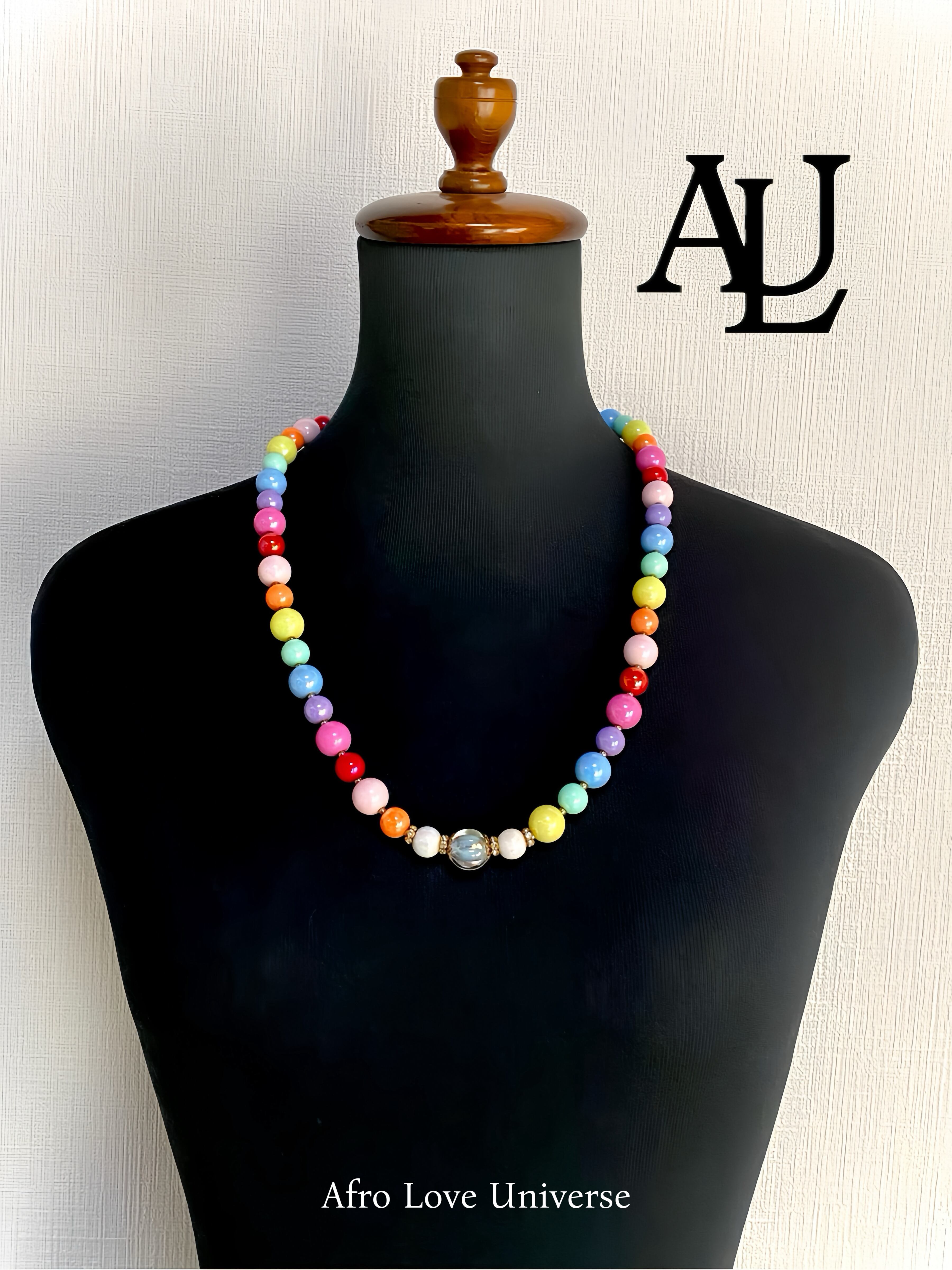 カラービーズを使用したロングネックレスで、アフロラブユニバースを象徴するアイテムにななっております。その鮮やかな色合いは、見ているだけで元気で楽しい気分にさせてくれます。シンプルな白のトップスと合わせることで、夏のコーディネートが一層引き立ちます。また、留め具がないデザインのため、着脱も非常に簡単です。もちろん他の色のお洋服にも幅広くお使い頂けます。