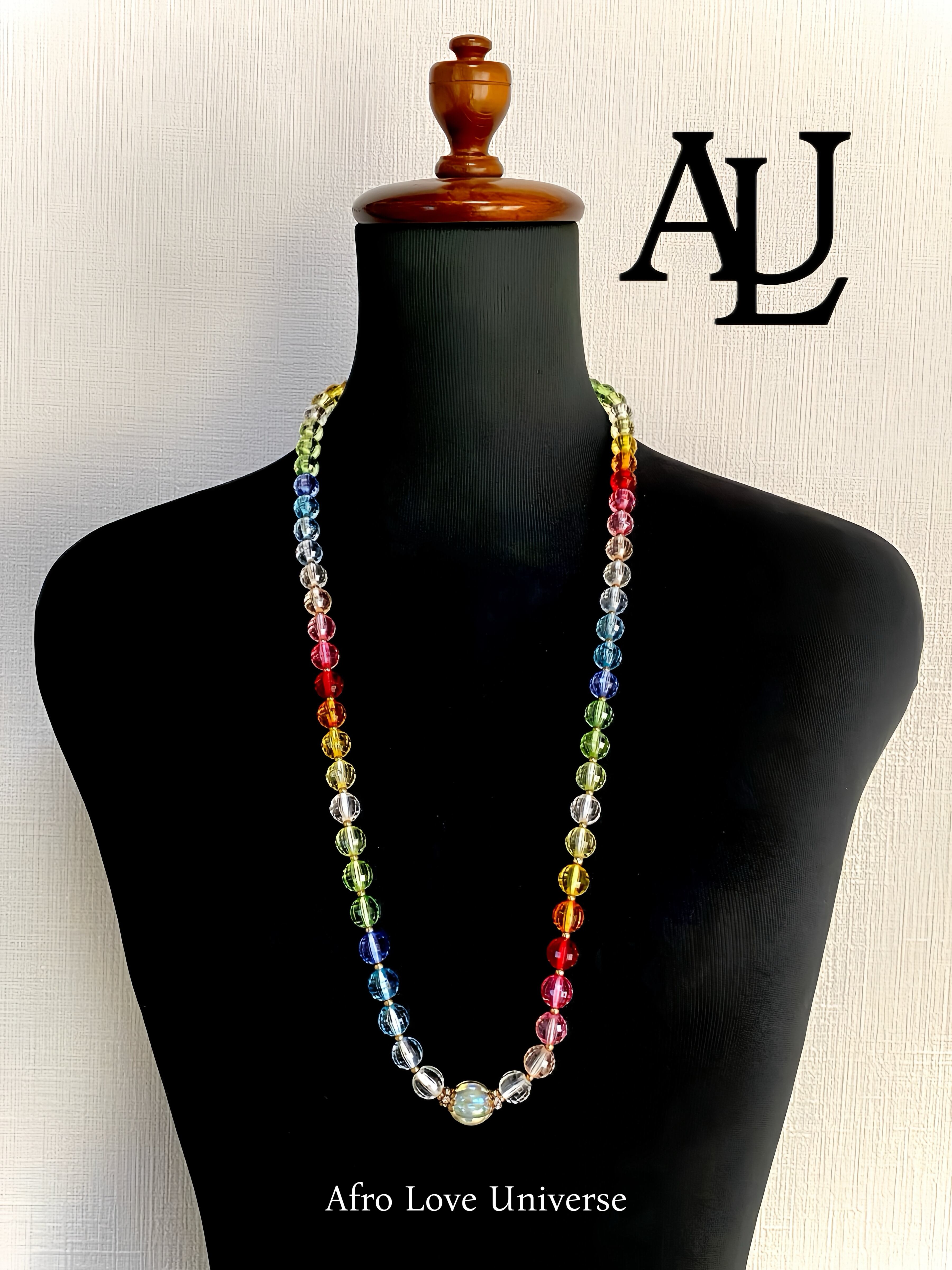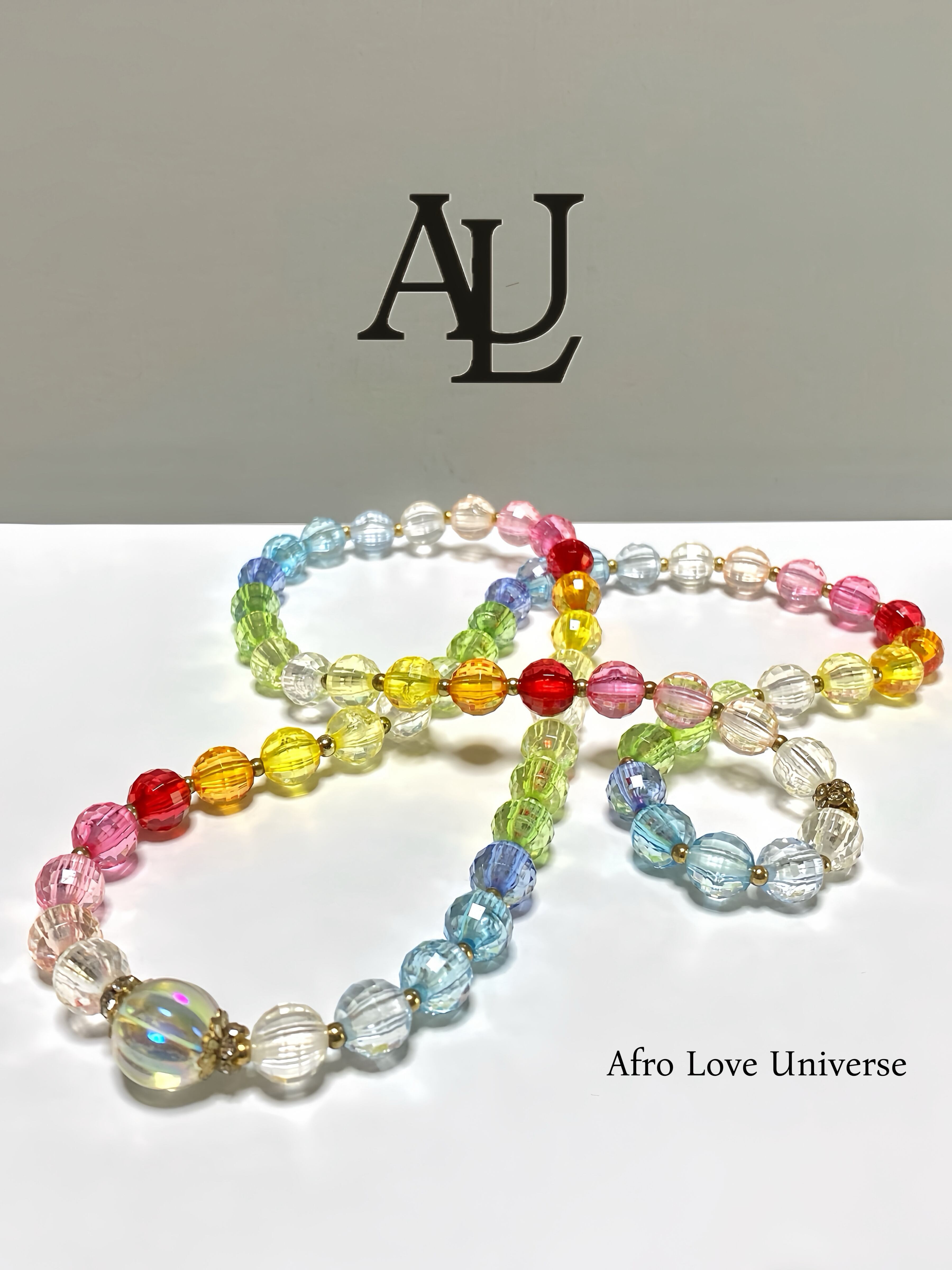 カラフルな透明ビーズを使用したデザインが魅力のネックレスです。一番美しいグラデーションになるように配置されているので光を受けて輝き、着ける人に華やかな印象を与えます。中心には虹色のビーズを配置しております。一つ一つのビーズが個性を引き立て、あなたのスタイルに遊び心をプラスします。留め具がないデザインなので、着脱も楽々。普段使いから特別な日まで、さまざまなシーンで活躍するアイテムです!